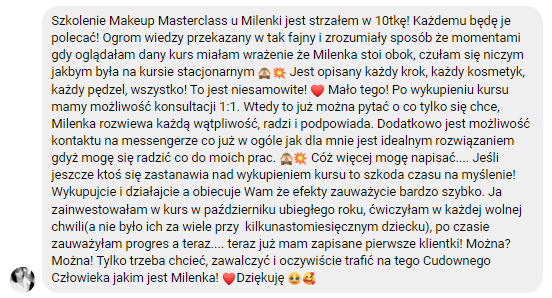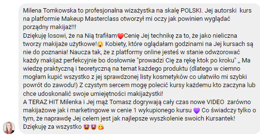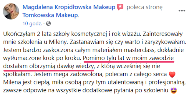 👉Ten kurs powstał ma bazie moich osobistych doświadczeń, dziesiątek szkoleń i ponad tysiącu wykonanych makijaży. Nim opracowałam Makeup Masterclass, sama borykałam się z brakiem dużego progresu. W moich social mediach mało się działo, a na co dzień marzyłam, aby być najlepszą w mieście. Zobaczysz – Ty także możesz nią być!