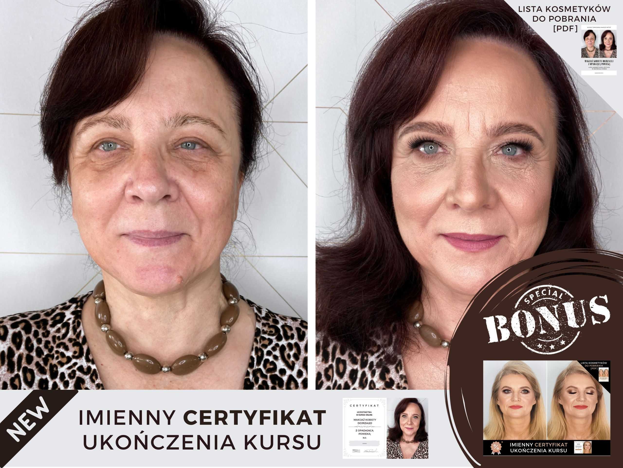 Otrzymasz dożywotni dostęp do 56 minutowego kursu Makijaż Kobiety Dojrzałej z którym osiągniesz jeszcze lepsze efekty swoich prac. Zobaczysz jak wykonać taki makijaż na innej modelce, dzięki czemu zyskasz więcej doświadczenia i większą wiedzę.